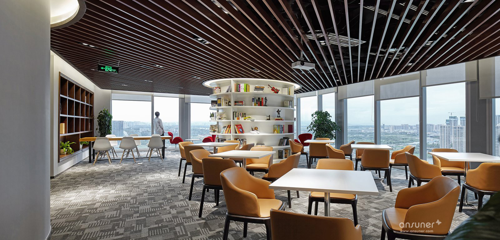 环形全落地窗、视线开阔、空间宽敞明亮。可同时容纳全体员工,兼具活动、茶歇、书吧、讨论等功能。