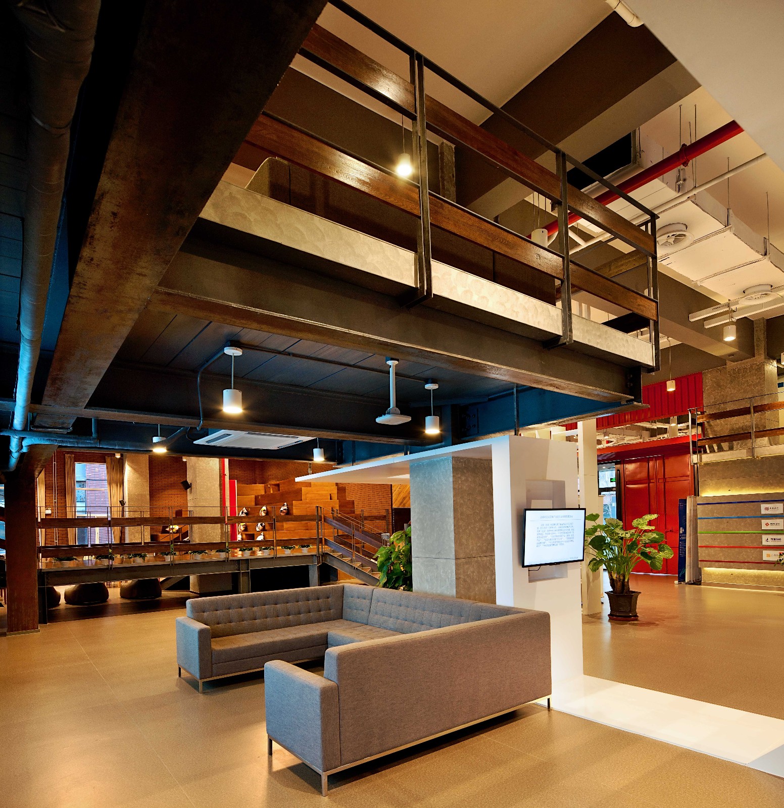 入口处醒目的大红色门厅,墙壁饰面采用集装箱纹理,与接待台后的木色饰面即形成了鲜明对比,同时又烘托出了温暖、开放的环境氛围,独特的工业风格特色让人第一眼就留下深刻印象。铁制的接待台经过特殊锈化处理,展现出了斑驳仿旧的视觉效果。