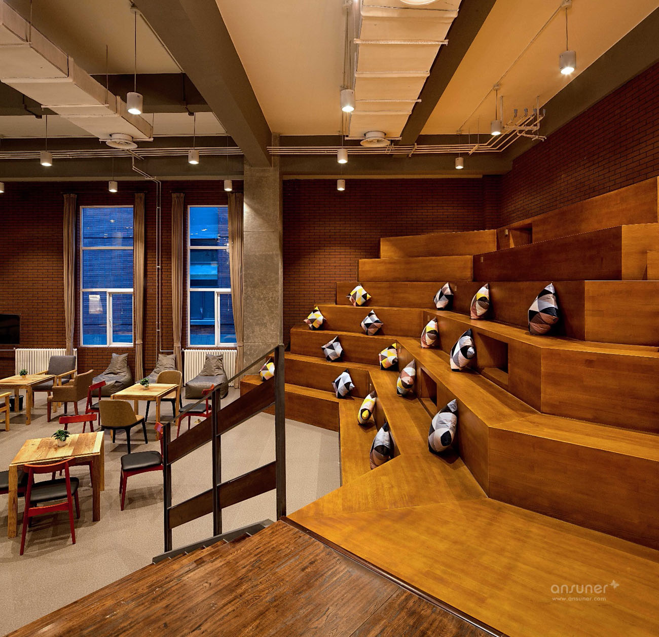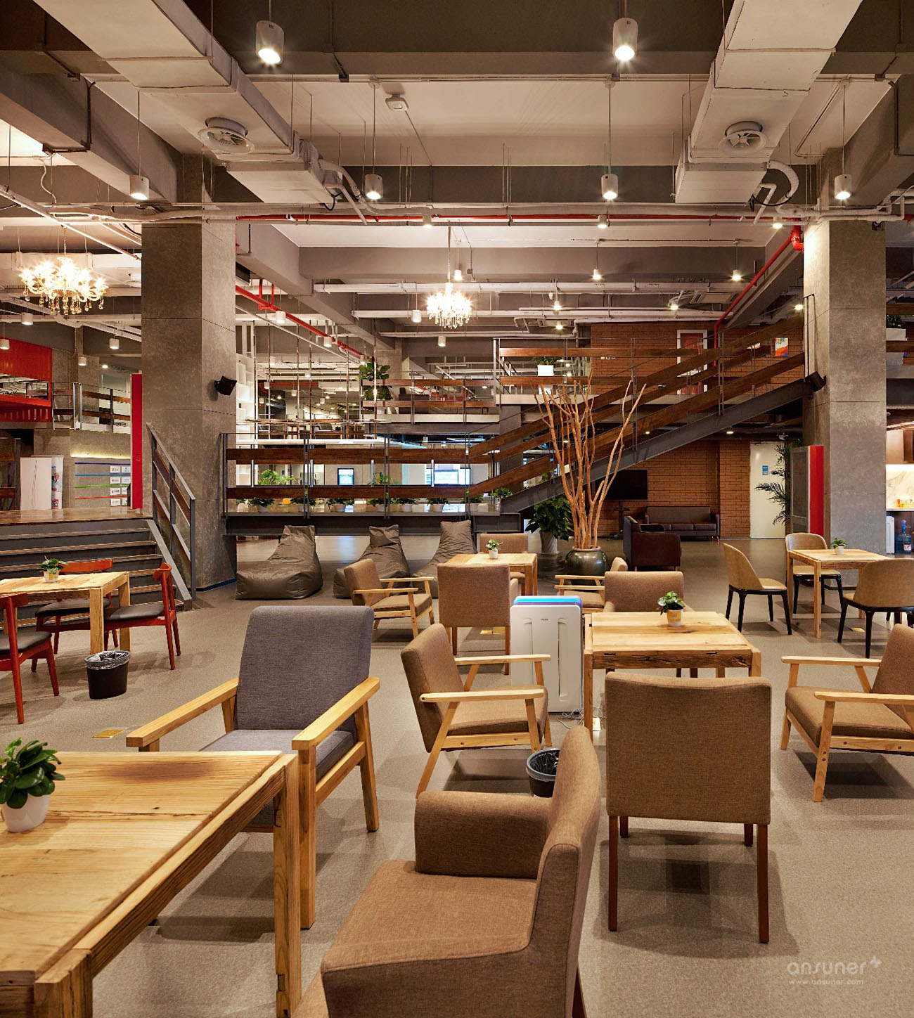 裸露的混凝土结构讲述着这里的历史,木材的质感传达出温暖与热情,绿植的点缀营造了舒适自然的环境。略带复古的氛围,让人能够瞬间放松心情。沉稳的铁艺栏杆穿插其间,既保证了使用功能,又成为环境中的勾勒与点缀。