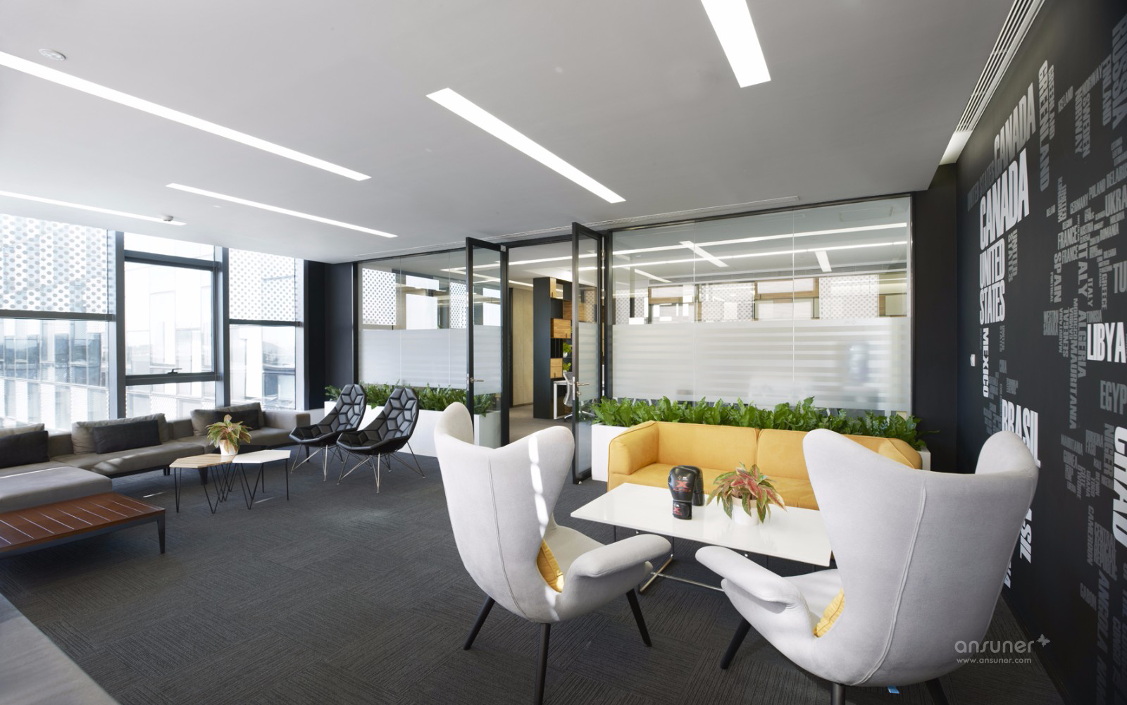 空间以灰白和木色为主色调,局部空间用鲜艳亮色加以点缀和活跃气氛。整体设计风格现代,稳重中又不失活力与激情,且处处体现着公司对员工的人文关怀。
