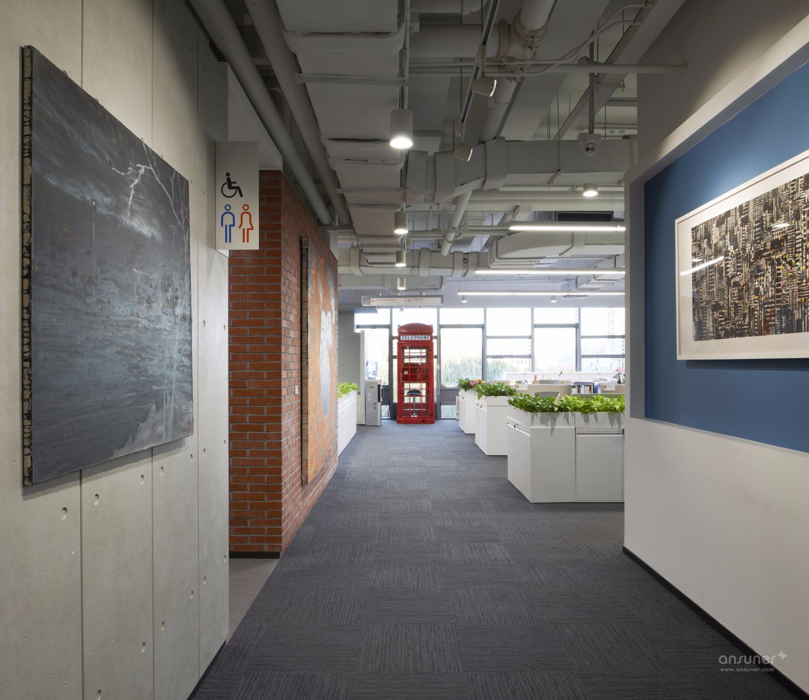 开放办公区以干净的白色调为主,局部以红砖墙为点缀,再配以鲜红色复古造型的电话亭,整个空间简洁明快,充满现代气息又有十足的趣味。