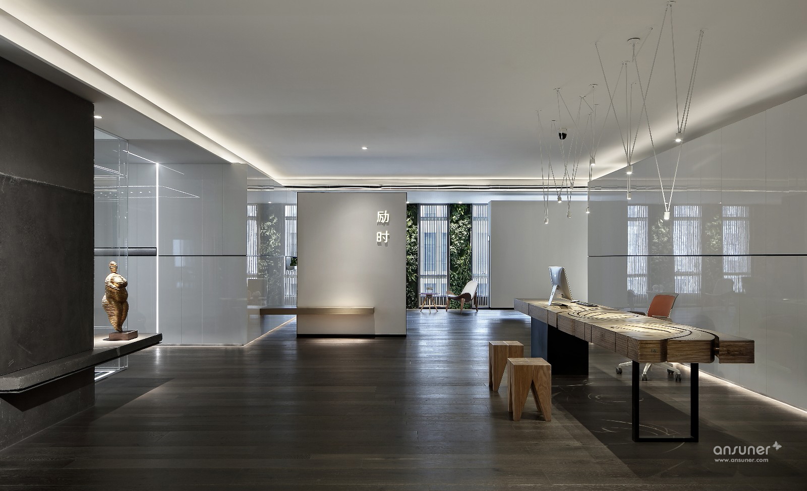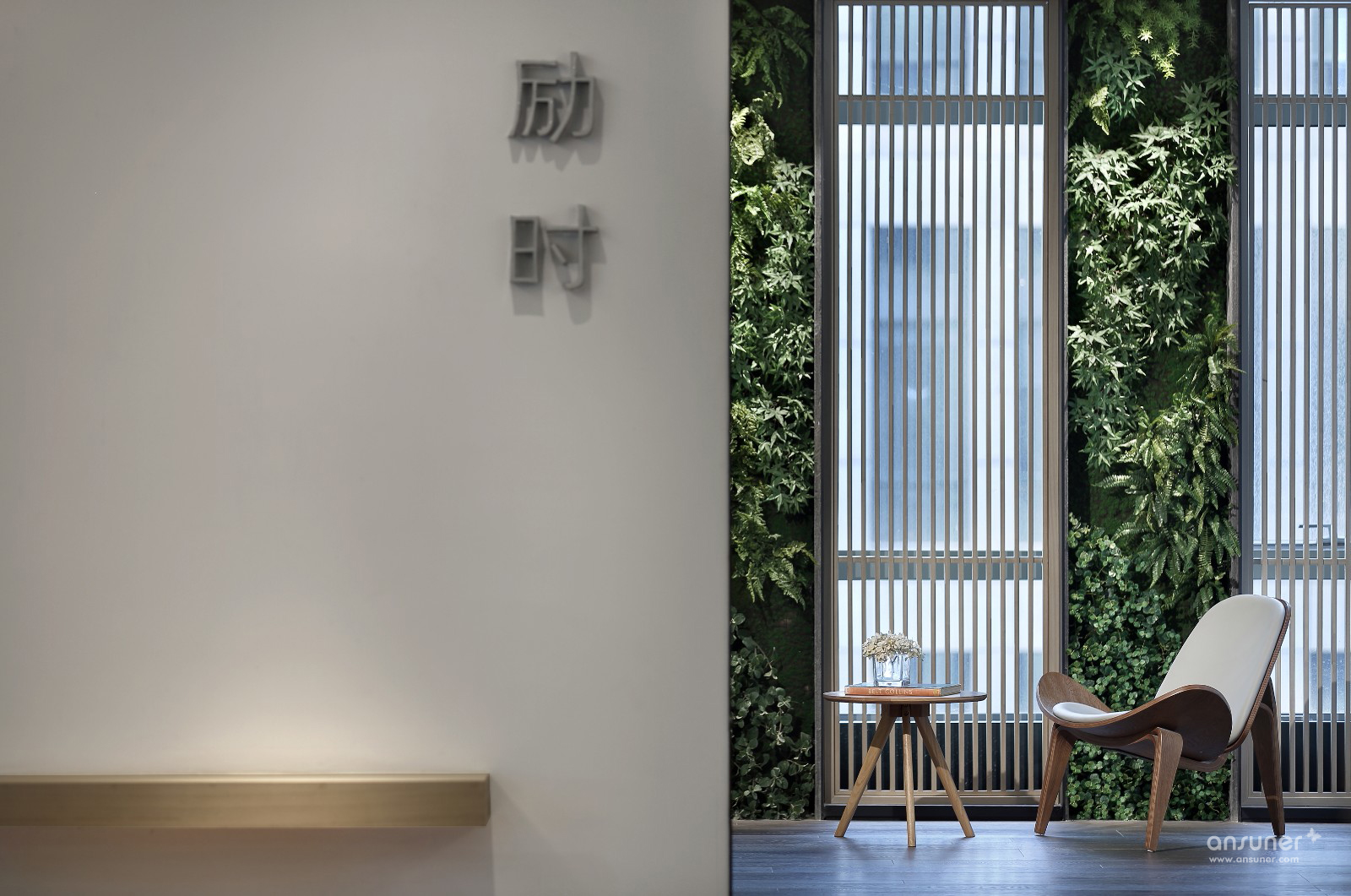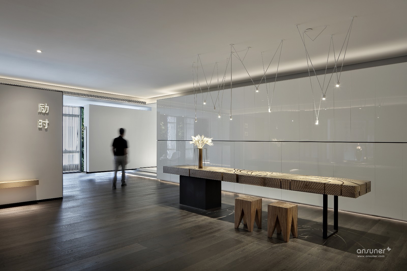 门厅接待区的视觉呈现,表述空间设计的构想初心。设计并未沿用对称、均衡的常用手法,而是以错位、悬拉的三面白墙,细分空间三重场域。