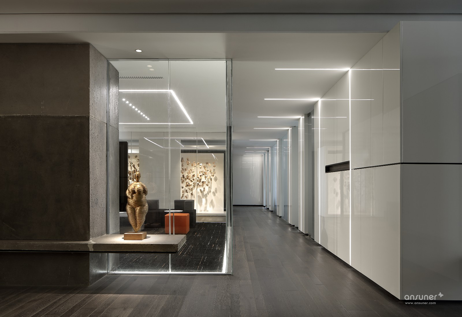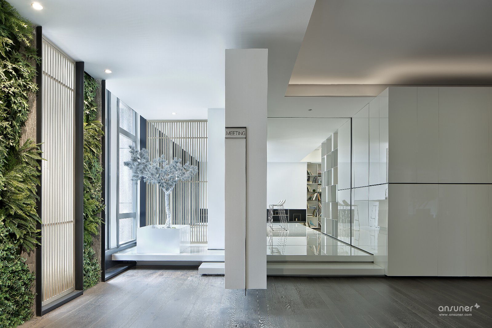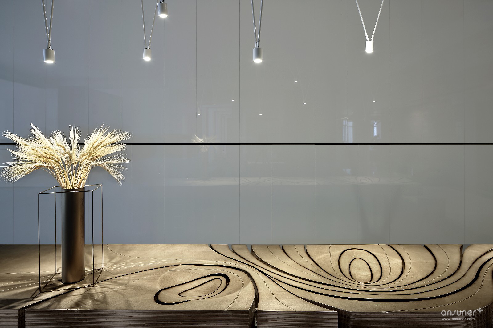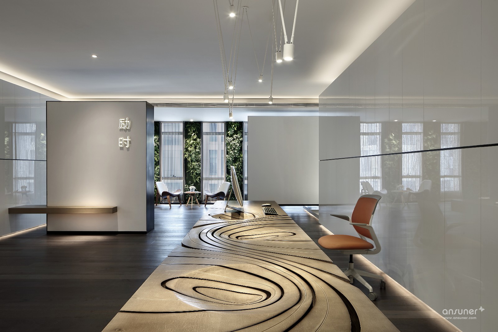 门厅接待区的视觉呈现,表述空间设计的构想初心。设计并未沿用对称、均衡的常用手法,而是以错位、悬拉的三面白墙,细分空间三重场域。