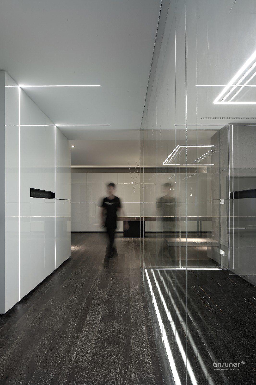 都说光是设计的最高手法,作为以室内设计入手的设计师,很难有很好的机会阐述对自然光的应用。此次,设计利用三道白墙的留缝处理,将自然 光请进室内,从而将原本空间中最暗的区域,锻造成整个空间的亮点