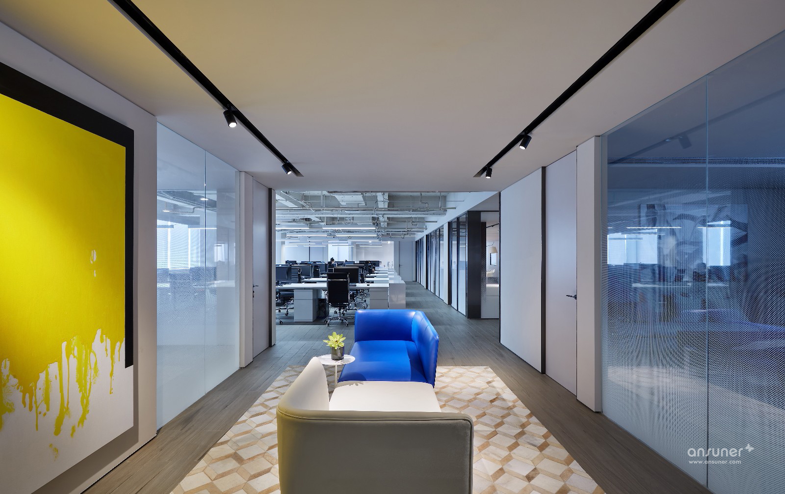 进入空间的一刹那,你就能感受到来自开放的空间氛围以及舒适的光线,从而营造出一个适宜停留的空间感受。室内大面积的留白,严肃安静让人平心静气,跳跃的蓝黄点缀,又带来无限活力。它是一个可以学习也可以用作商业办公的地方,在这里,信任、分享与享受并存。