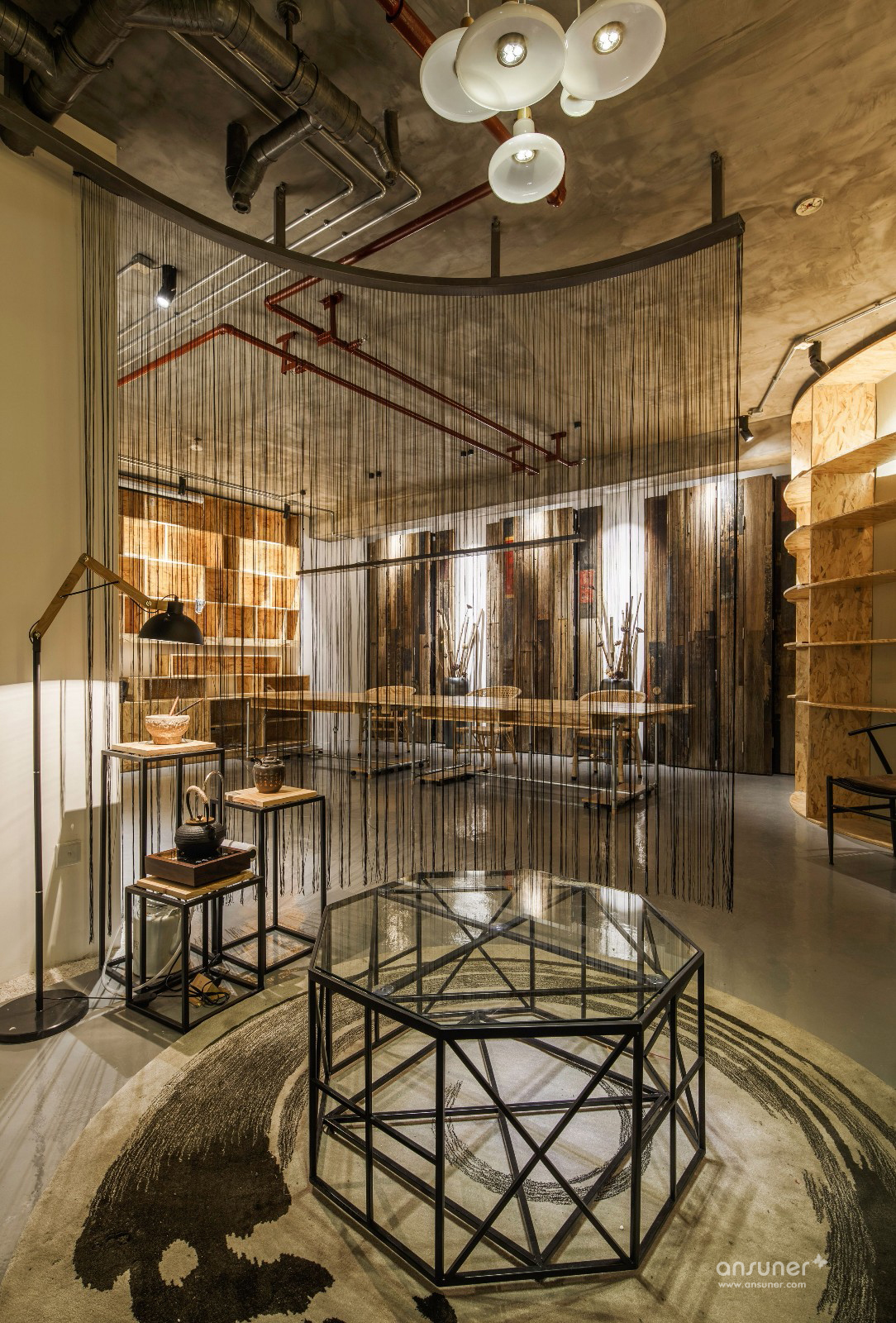 设计师通过保留清水水泥裸顶、消防管道,轻松的天花布线,以及大面积的原色欧松板,工业风直白的空间叙事,一起写下了设计本质的批注。