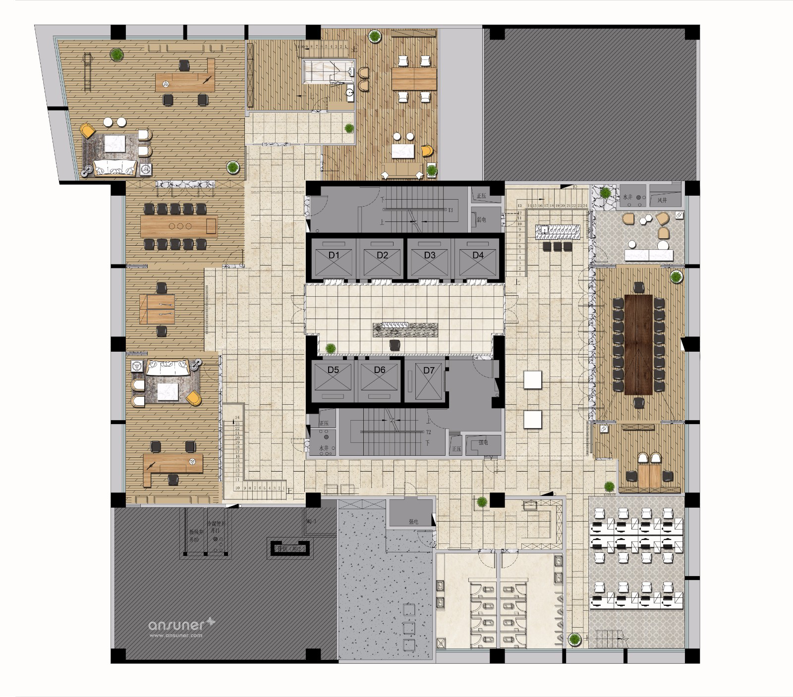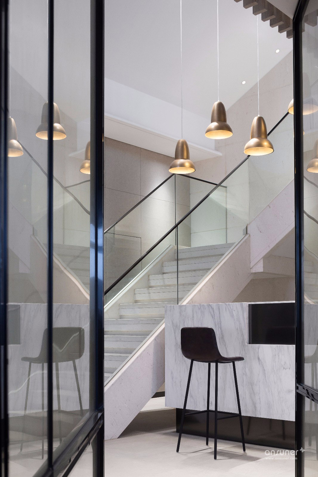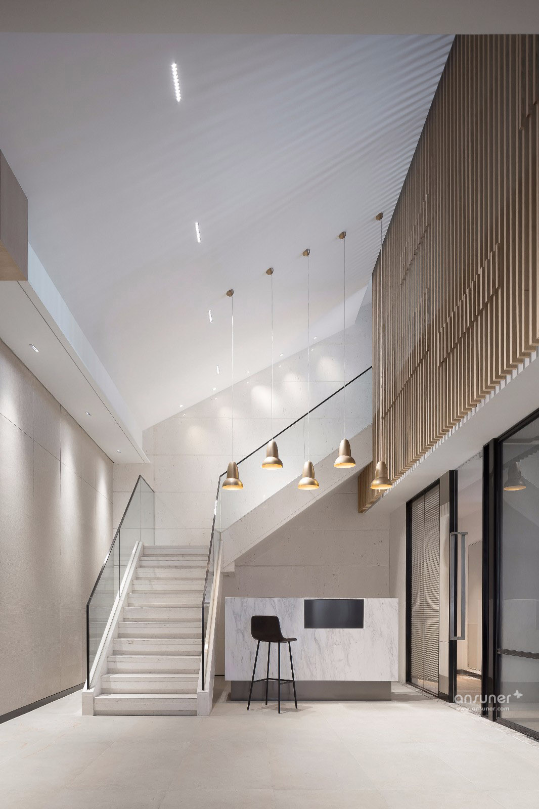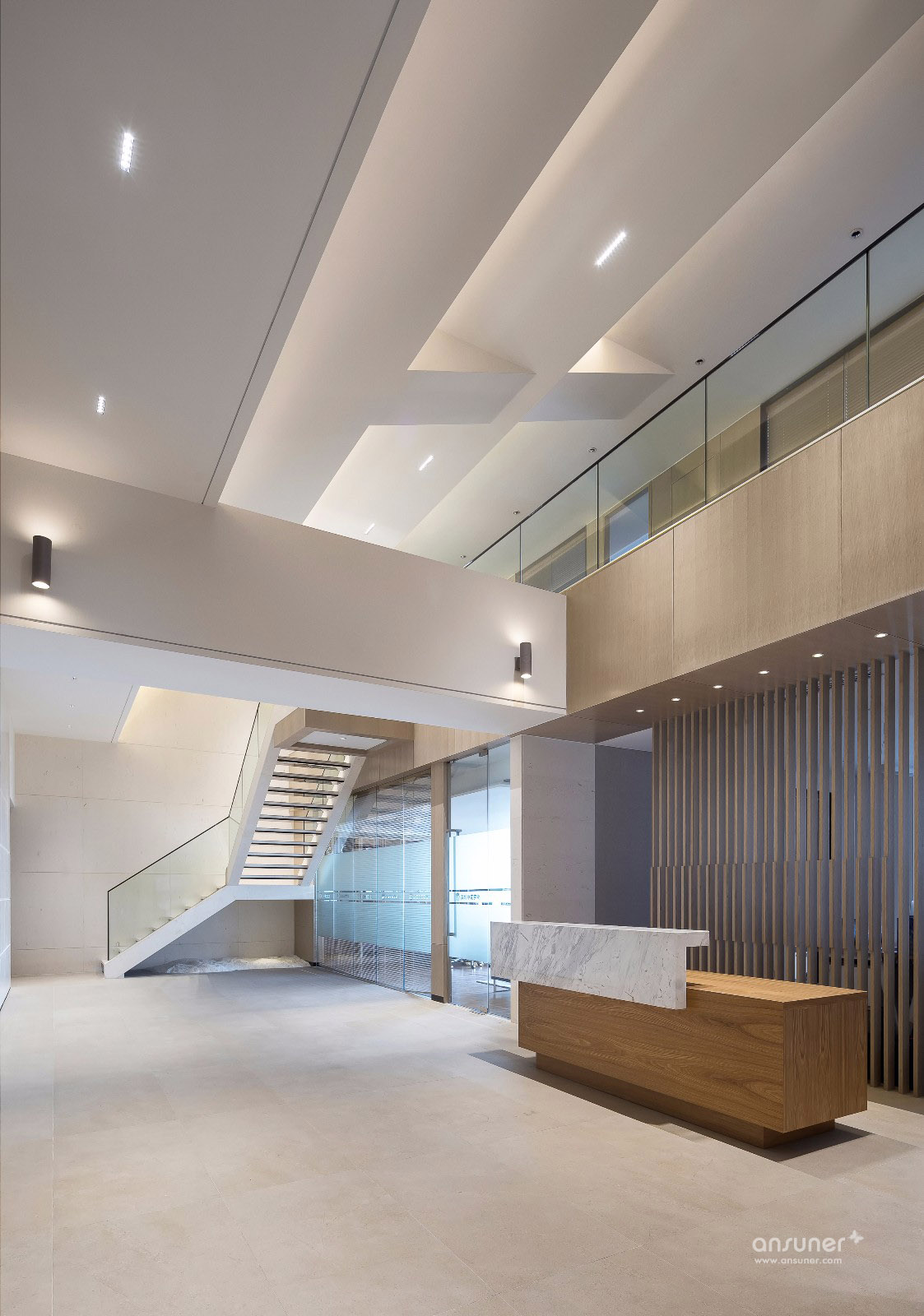 本案位于深圳高新技术园区,都市最前沿的创业基地。金融市场风起云涌,昼夜忙碌,竞争十分激烈。贝森豪斯设计团队希望为企业创造一个简约、清雅而不失时尚感的办公环境,让人置身其中,身心舒畅,将所有的压力于纯净平衡的氛围中得以释放,工作时光亦可从容惬意。