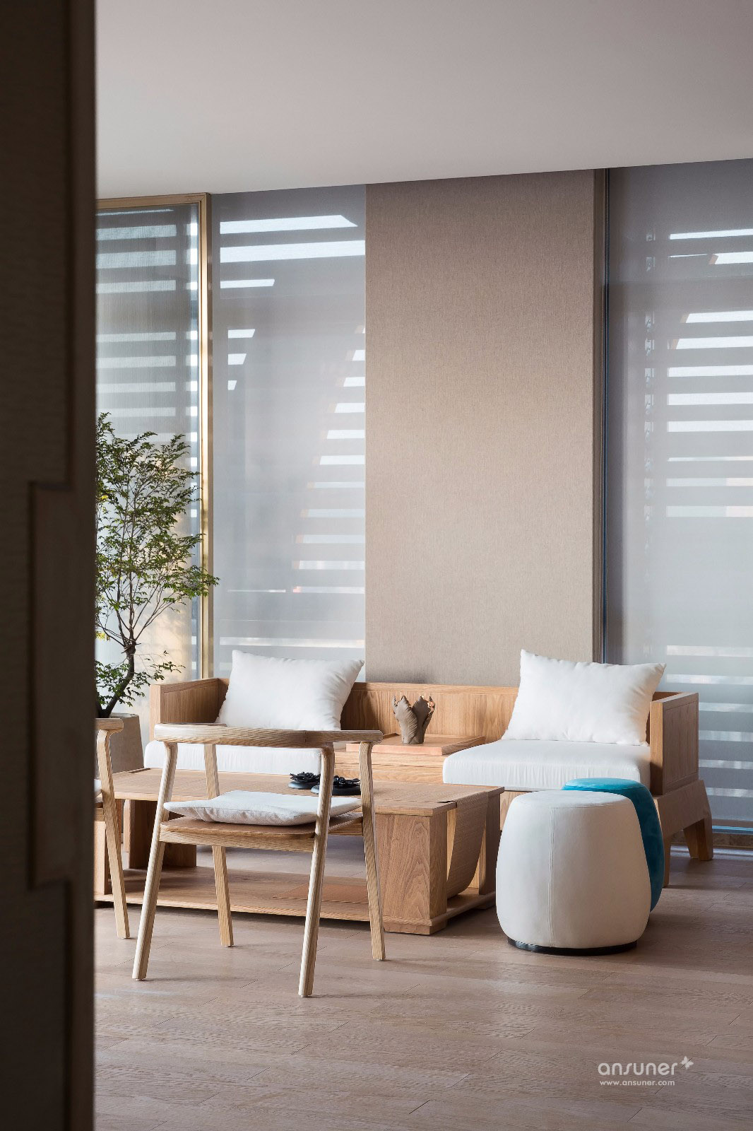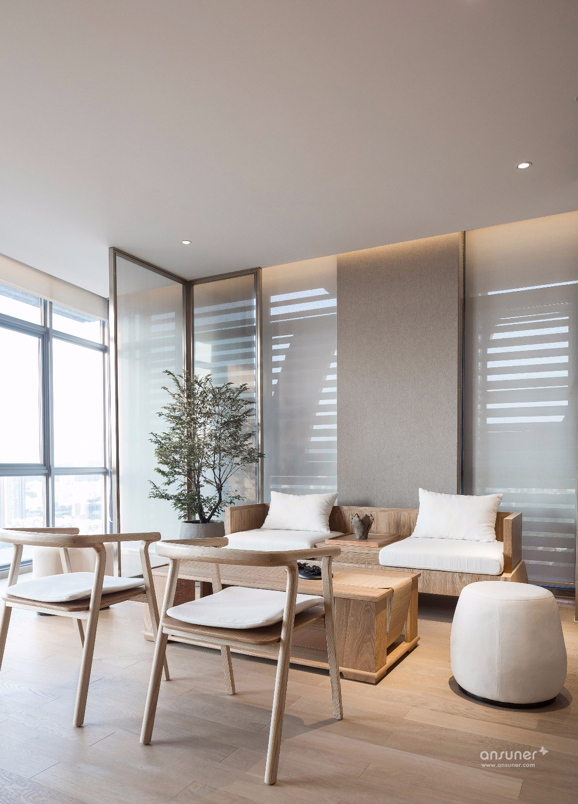 整体空间追求轻松、宁静之感,摒弃不必要的浮华。设计强调以纯粹的材质体现品味,以利落的线条丰富视觉,剔除一切繁琐的装饰元素。纯白的主色调与质朴的木材带来清新自然的感受,通过阳光与透明材质的搭配,缓解办公紧张感的同时,营造出大气优雅的氛围。