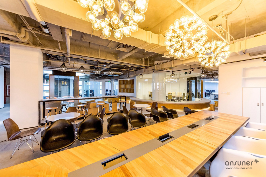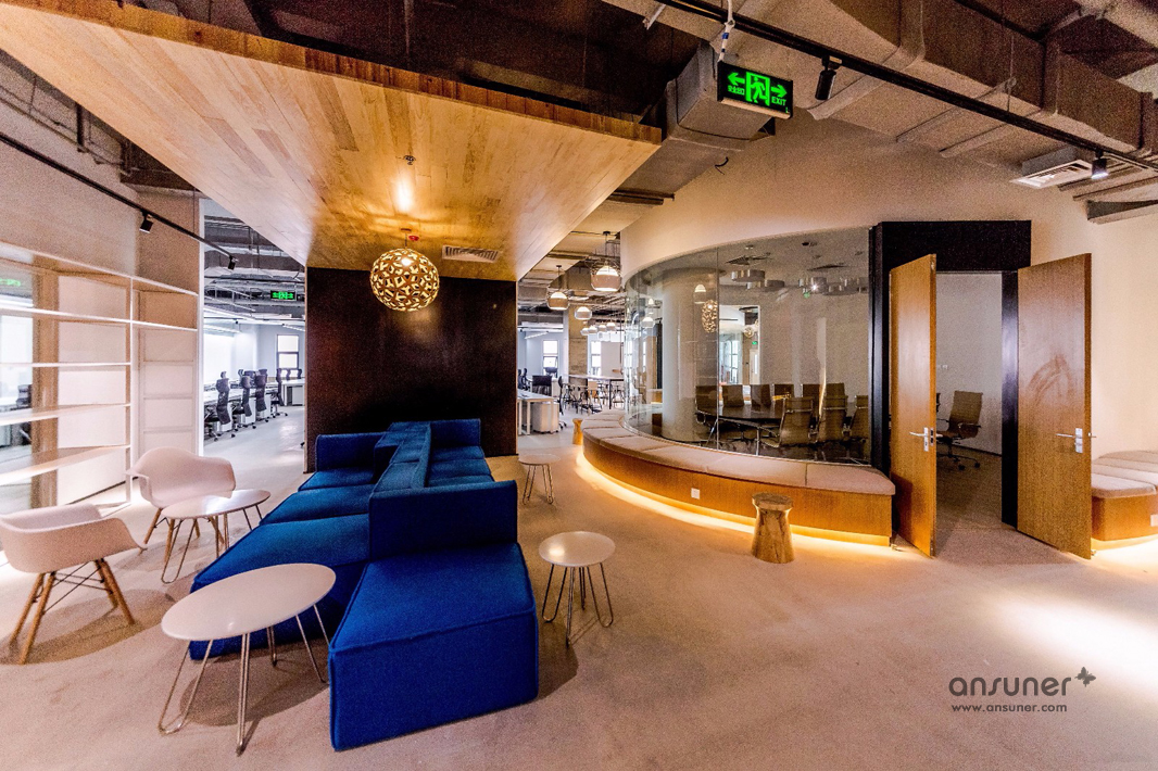 圆弧形的会议室和休闲区是本次设计的核心,也是凸显共享和交融的重点,通透的玻璃会议室和无遮拦的休闲区设计形成完美的结合。休闲区的设计得益于当今的科技发展,移动式办公成为可能。标注办公桌渐渐转化为共享办公桌,多元化的移动办公方式提供了更丰富的选择。个人固定办公桌时代已经成为过去,员工要考虑的事情就是选择哪里更合适今天的心情、今天的工作。